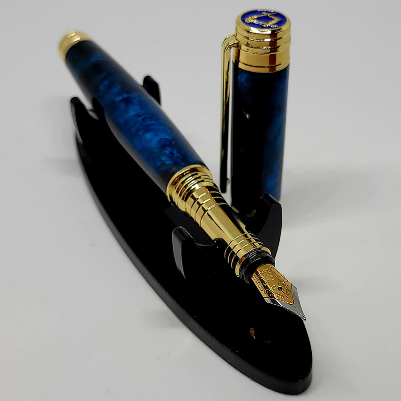 Beautiful streamline pen, 12 karat gold plating with a midnight blue and black mix of colours. The gold inlaid masonic symbol highlighted with blue enamel.
